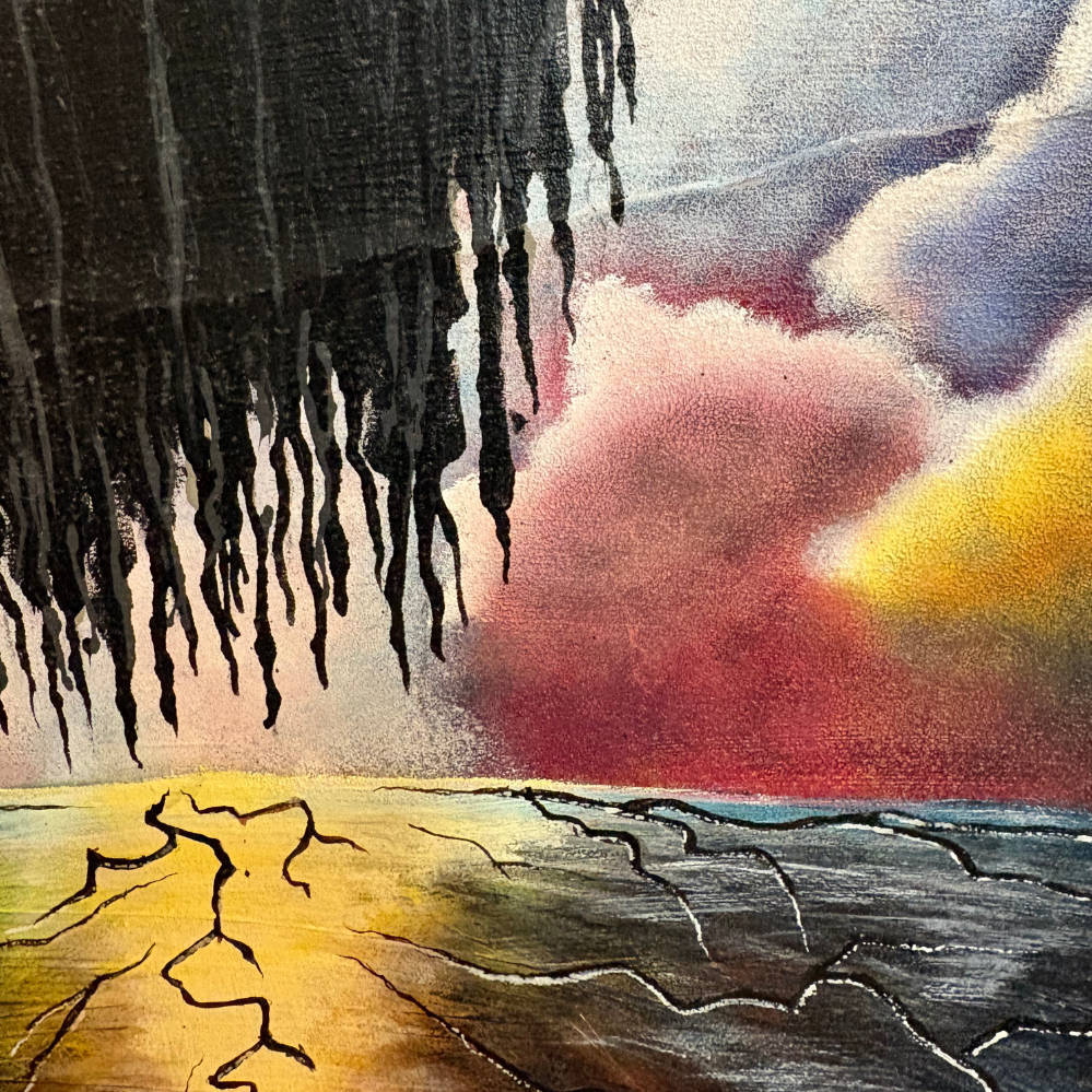 Die Komposition lebt von starken Kontrasten: Während der Himmel in intensiven, fast surrealen Farbverläufen aus Blau, Rot und Gelb leuchtet, wirkt der Boden darunter gebrochen, kalt und unwirtlich. Ein einzelner Lichtstrahl durchzieht die Szenerie und erzeugt eine visuelle Spannung zwischen Hoffnung und Verfall – ein klassisches Merkmal moderner dystopischer Kunst. Genau hier entfaltet die Acrylmalerei ihre Stärke: Die kräftigen Farben und die strukturierte Oberfläche verleihen dem Werk Tiefe und Dynamik, die sowohl aus der Nähe als auch aus der Distanz faszinieren.