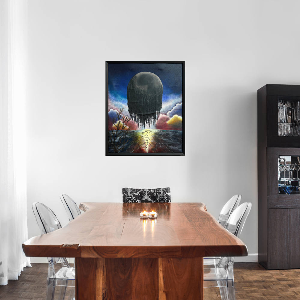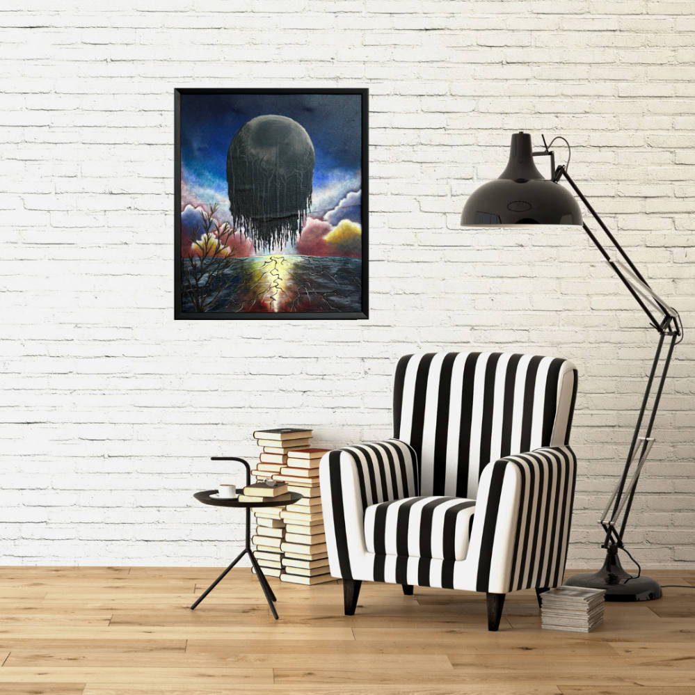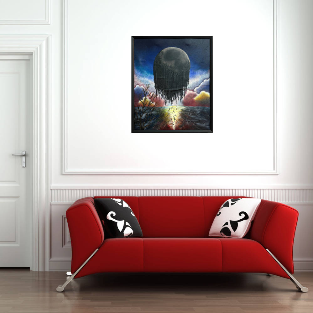 Stilistisch bewegt sich das Gemälde zwischen Surrealismus und zeitgenössischer Konzeptkunst. Es ist kein gefälliges Dekorationsstück, sondern ein Statement – ideal für Menschen, die nicht nur ein hübsches Bild für Wohnzimmer, Büro oder Sammler suchen, sondern ein Kunstwerk mit Bedeutung, Atmosphäre und einer gewissen „Was genau passiert hier eigentlich?“-Energie. Der Rahmen aus Holz ergänzt die düstere Ästhetik perfekt und macht das Werk sofort präsentationsbereit für jede Umgebung, die ein wenig mehr Charakter vertragen kann.