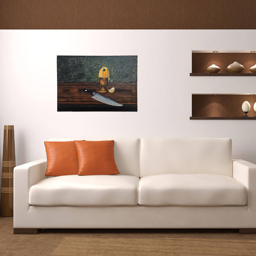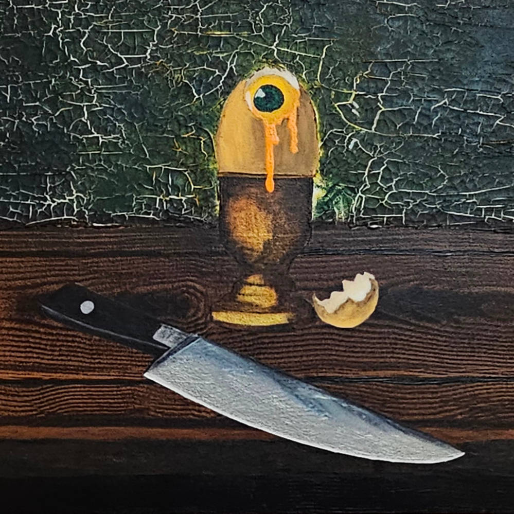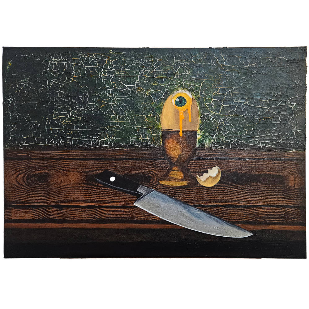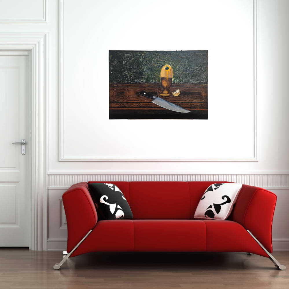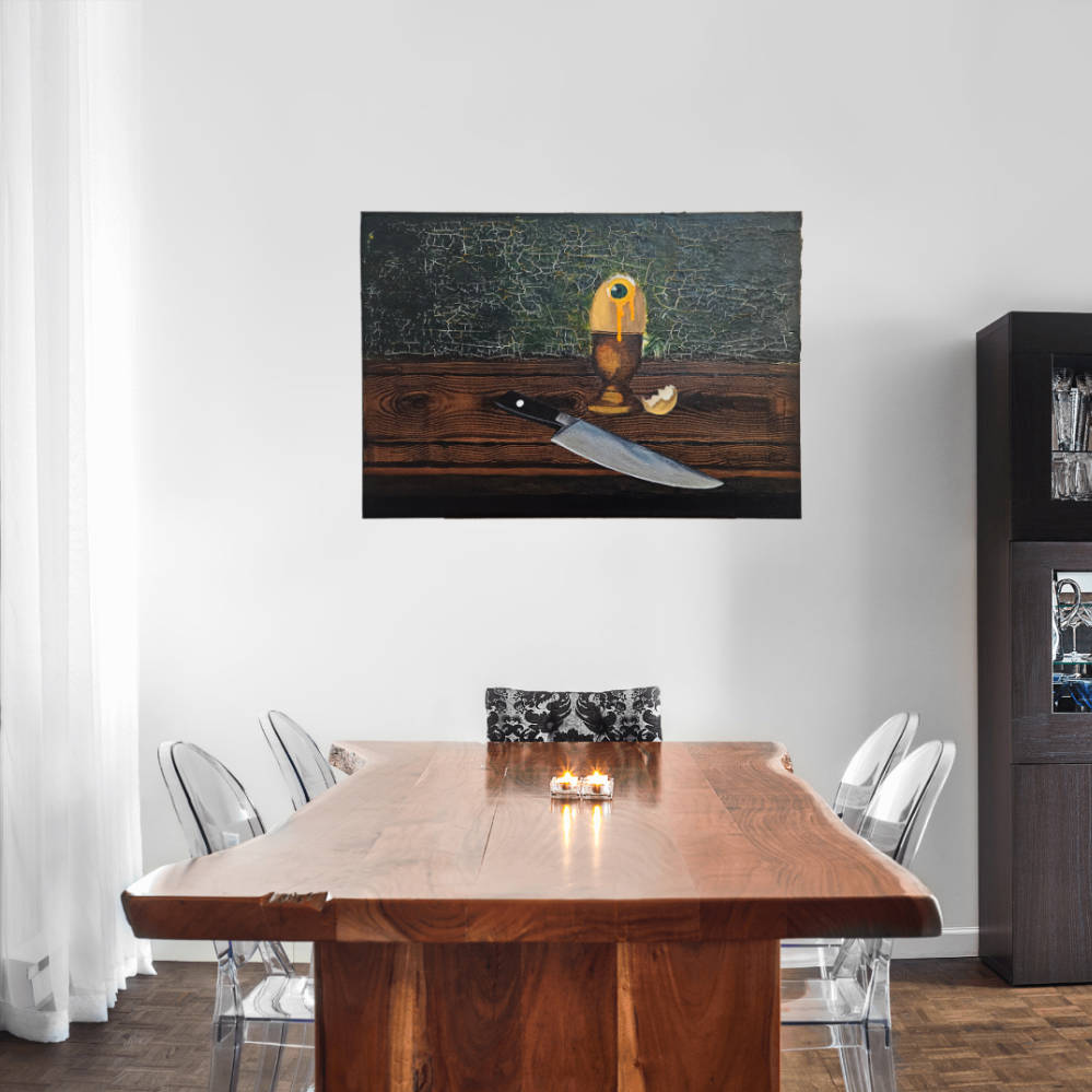 Zu Füßen des Eierbechers liegt ein markantes großes Messer, dessen Präsenz nicht nur visuell dominant wirkt, sondern auch die gedankliche Interpretation des Kunstwerks in eine düstere, vielschichtige Richtung lenkt. Die Spannung zwischen Alltäglichkeit und surrealer Symbolik verleiht diesem Gemälde eine außergewöhnliche emotionale Tiefe. Der Hintergrund, eine rissige und aufgebrochene Zimmerwand, verstärkt das Gefühl von innerem Zerfall und Konfrontation mit verborgenen Wahrheiten.