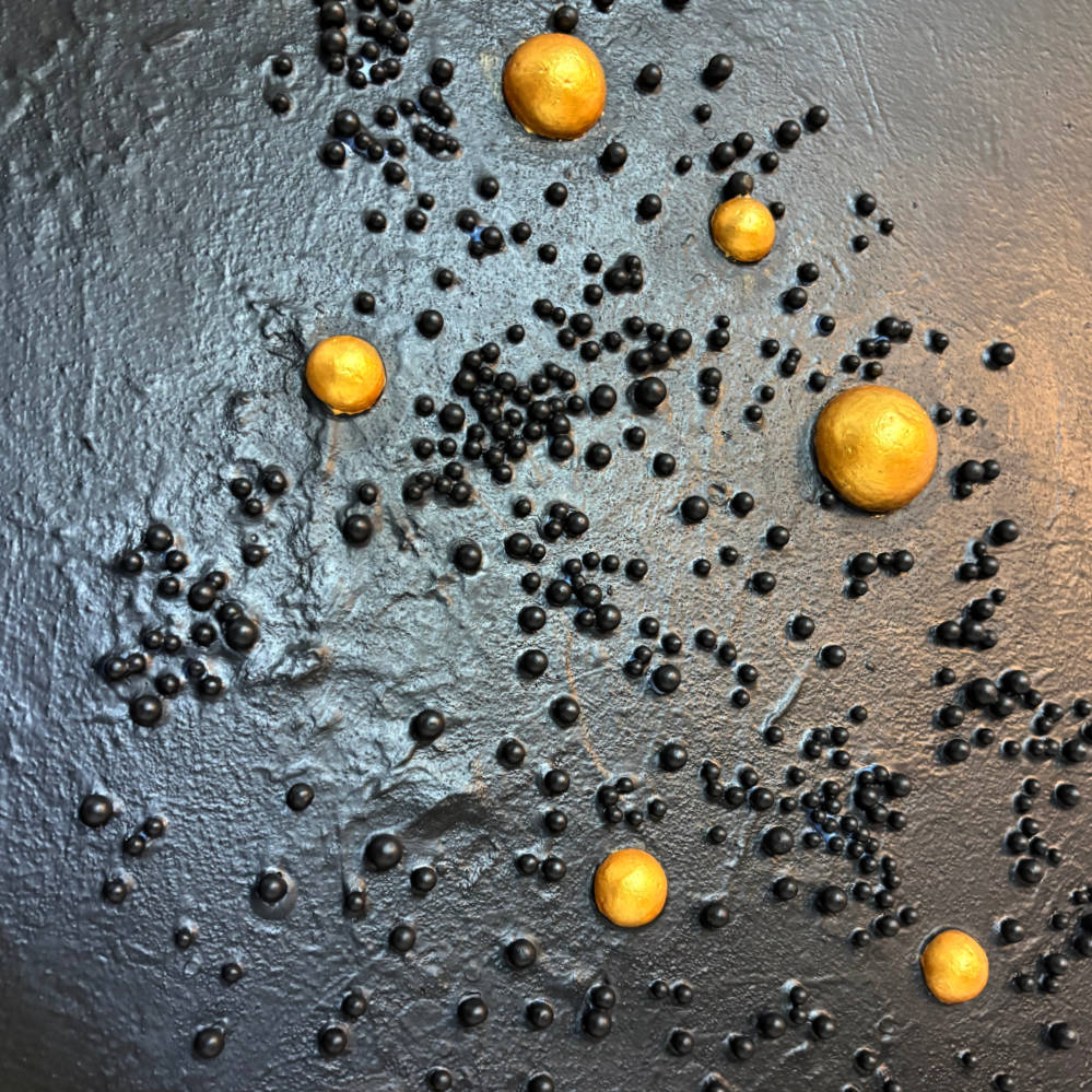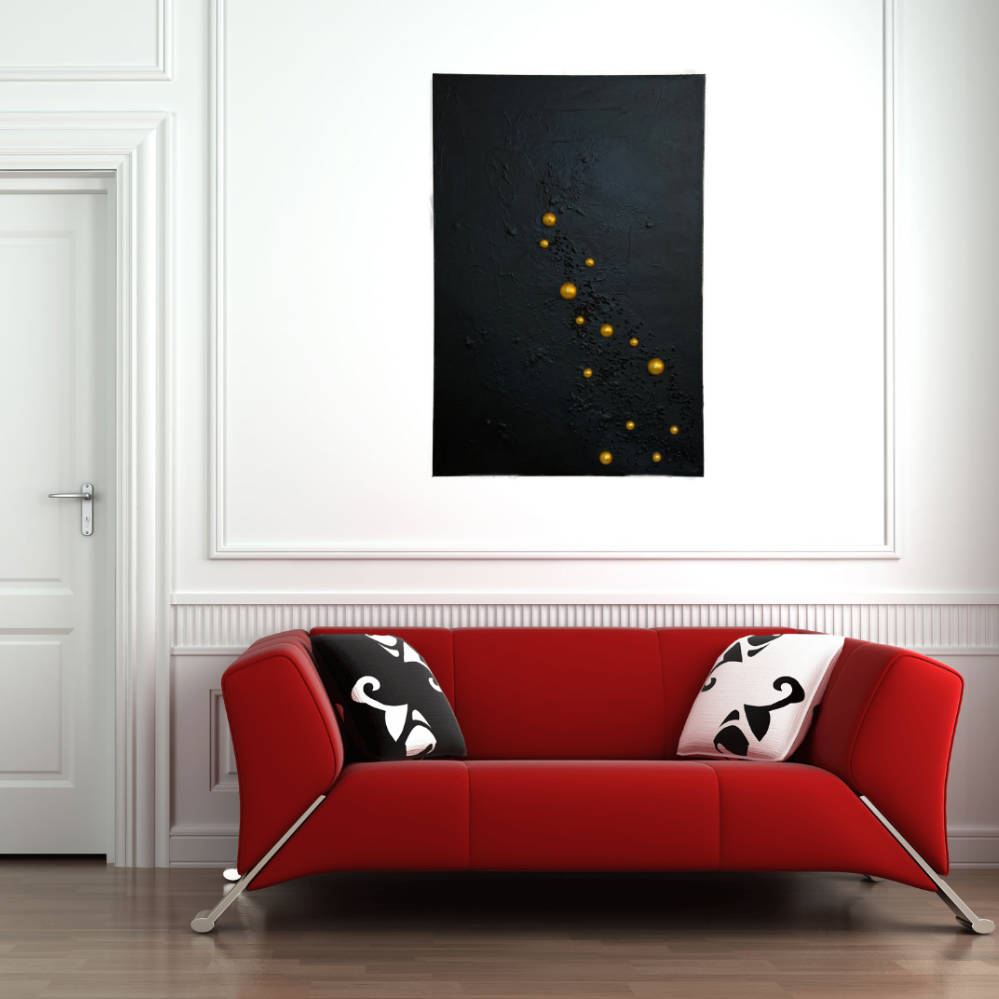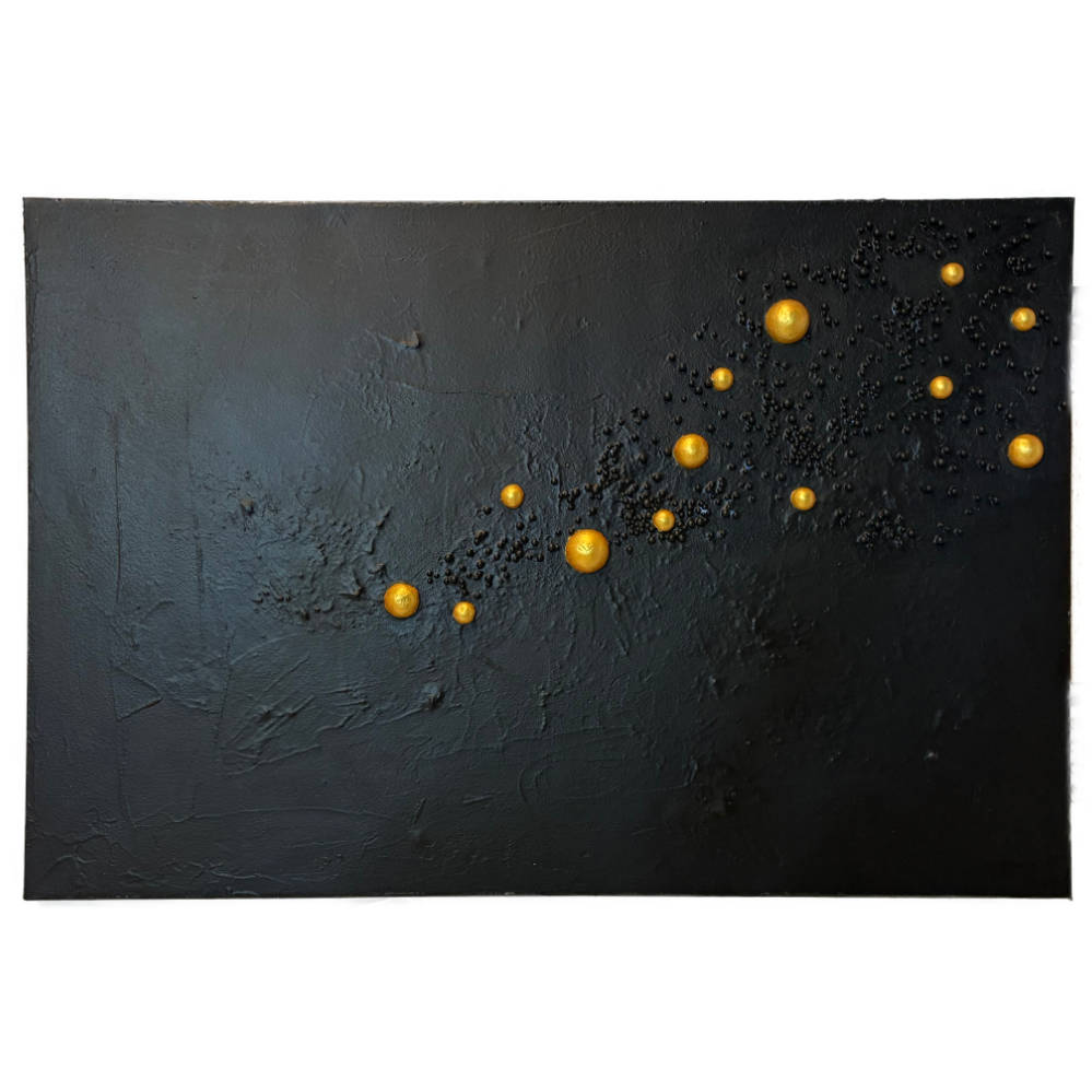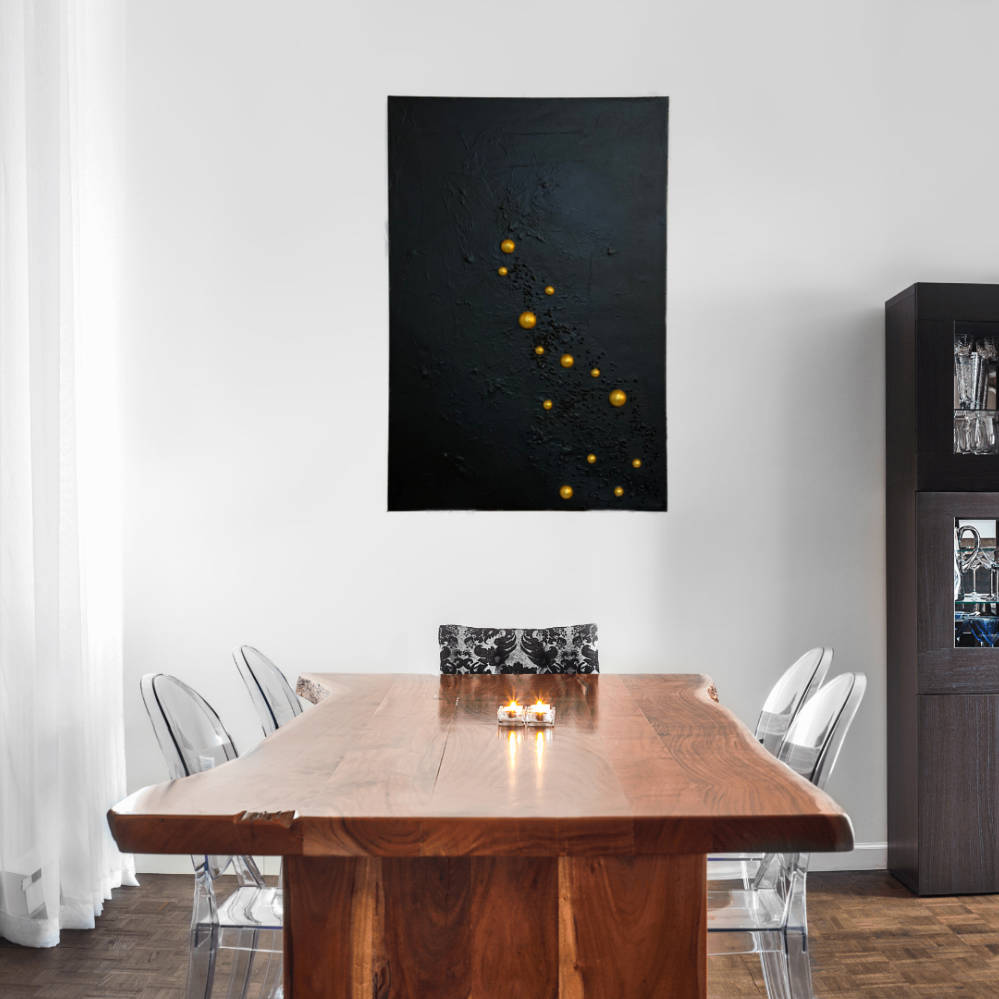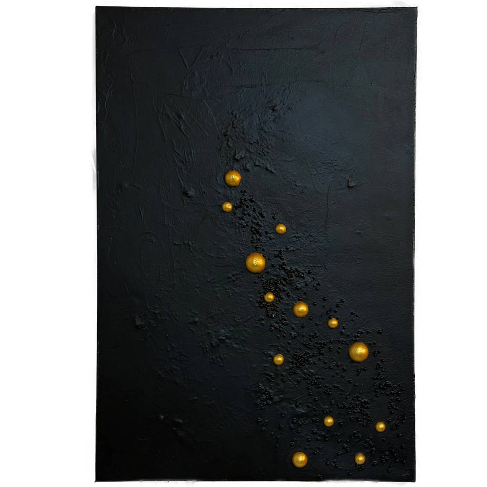 Dieses moderne Acrylgemälde ist ein echter Blickfang für stilvolle Wohnräume und zeigt, wie minimalistische Kunst maximalen Ausdruck entfalten kann. Auf einer tiefschwarzen, strukturierten Leinwand ziehen sich goldene, plastisch gearbeitete Kugeln in sanfter Diagonale nach oben – wie ein stiller Strom aus Licht inmitten der Dunkelheit. Die Kombination aus matter, reliefartiger Schwarzfläche und den edel glänzenden Goldakzenten verleiht dem großen Bild auf Leinwand in Schwarz und Gold Tiefe, Spannung und eine luxuriöse, zeitlose Ausstrahlung. Jede goldene Form scheint sanft aus der Oberfläche herauszutreten und erzeugt ein faszinierendes Spiel aus Schatten, Reflexion und Struktur, das je nach Lichteinfall immer wieder neue Eindrücke entstehen lässt.