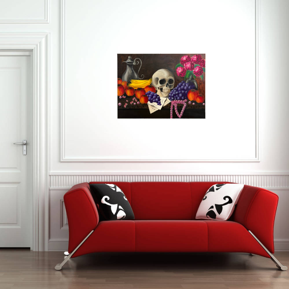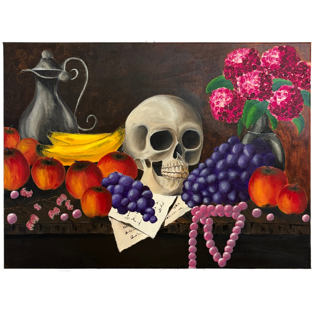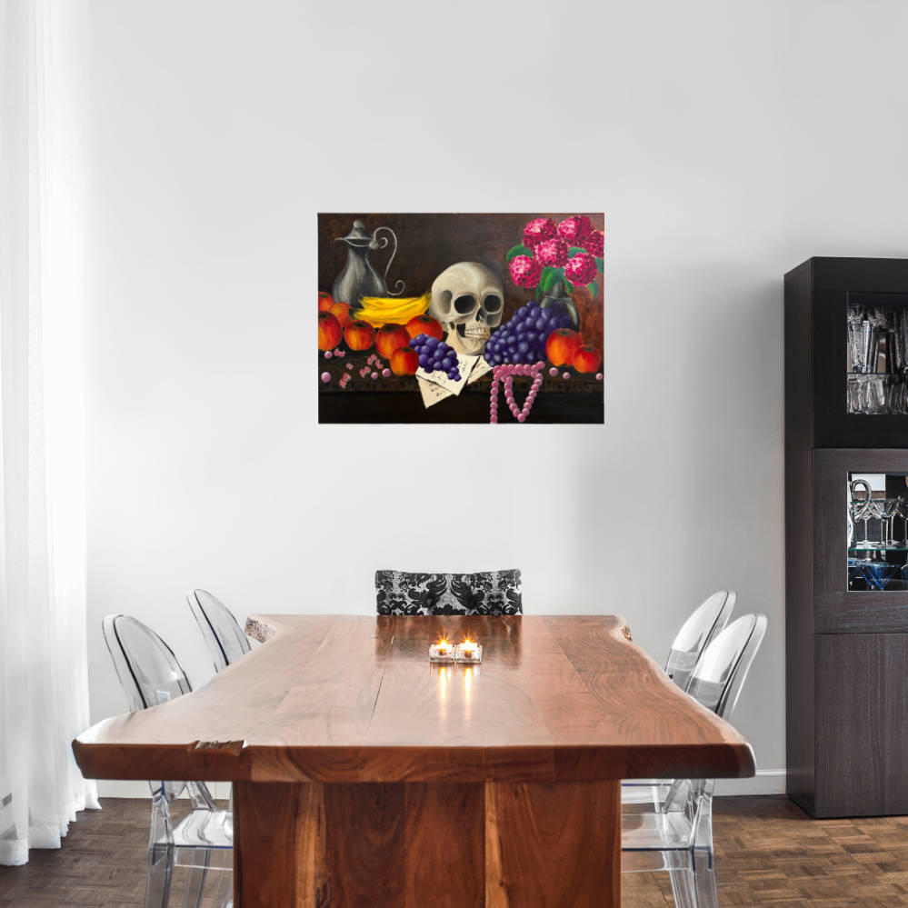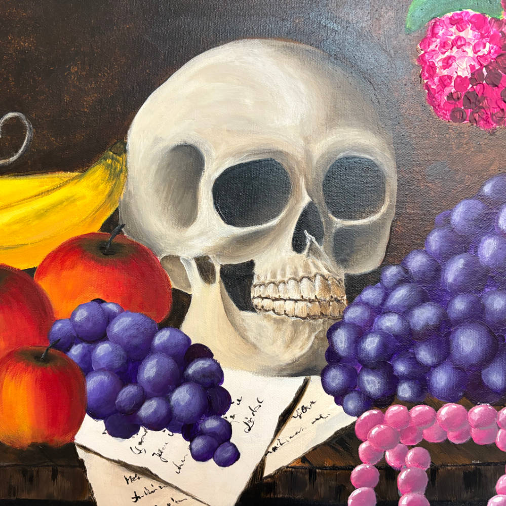 Die gegenständliche Malerei in diesem Werk ist bewusst gewählt: Jede Frucht, jede Blüte und jedes Objekt ist klar erkennbar und doch in eine fast surreal anmutende Bildwelt eingebettet. Die kräftigen Farben der Trauben und Blumen stehen in spannendem Kontrast zum neutralen, stillen Ausdruck des Schädels. Dadurch entsteht eine visuelle Spannung zwischen Leben und Tod, Genuss und Endlichkeit – ein klassisches Thema der Kunstgeschichte, hier neu interpretiert durch die Handschrift der modernen Acryl Malerei.