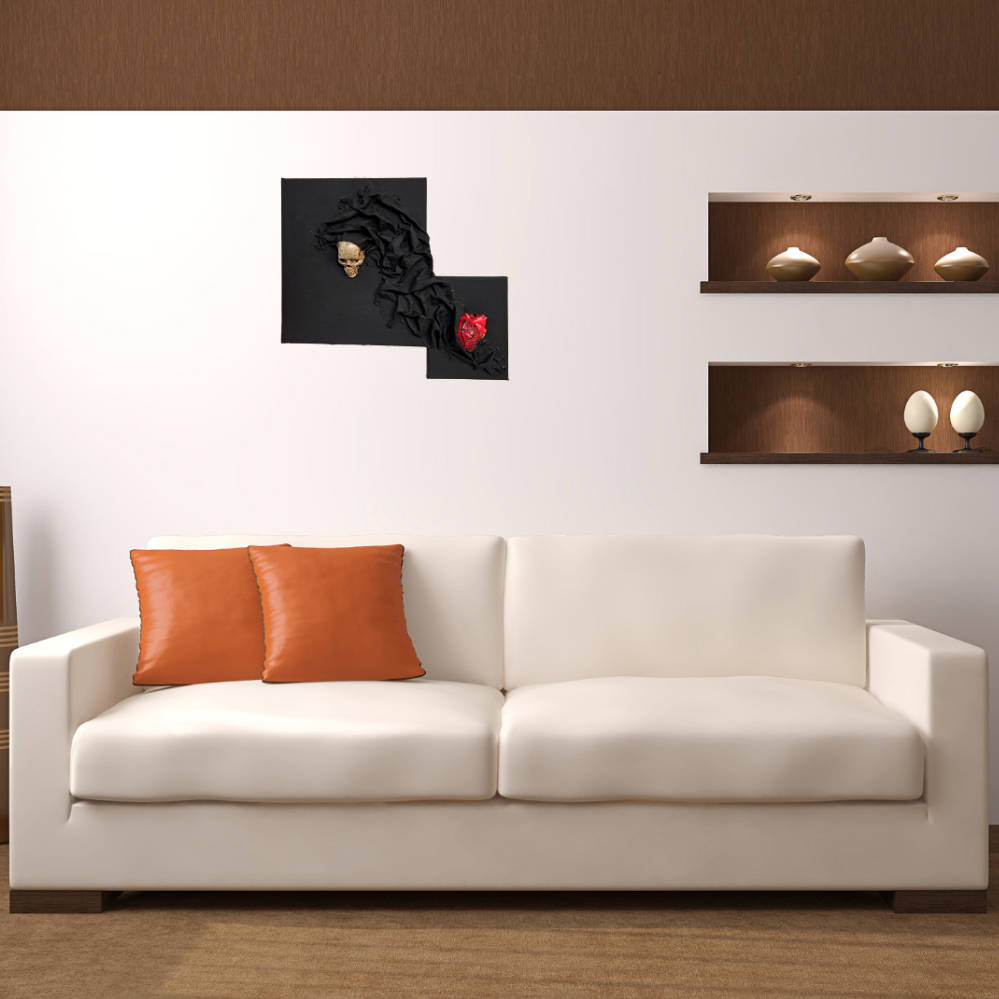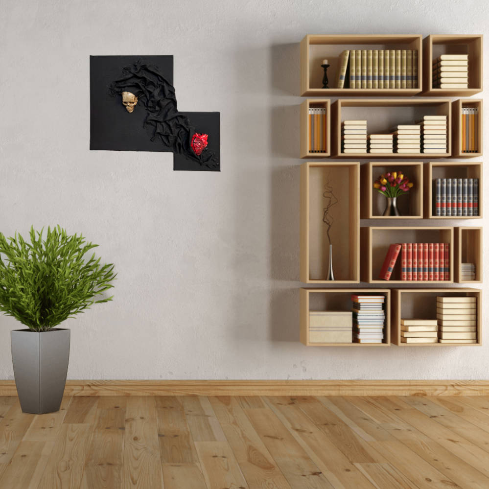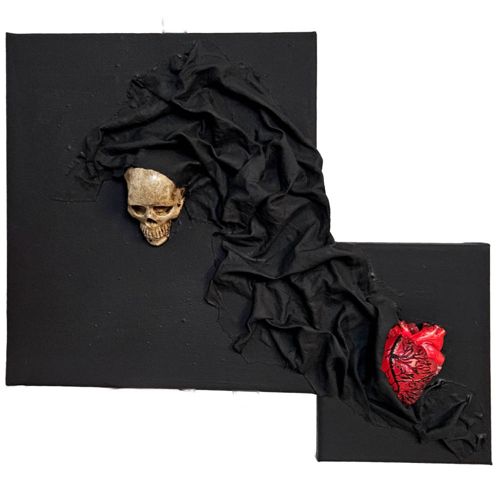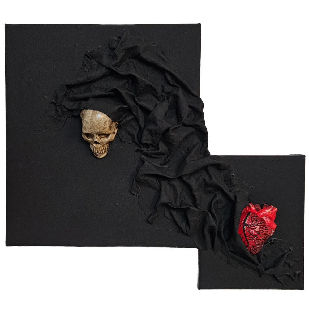 Dieses einzigartige kleine Gemälde vereint Symbolik, handwerkliche Präzision und moderne Ausdruckskraft in einem fest zusammen gefügten Gemäldeset. Auf schwarzem Untergrund entsteht ein eindrucksvolles Spiel aus Kontrasten: Ein detailreich gearbeitetes, handgefertigtes Herz aus Resin in leuchtendem Rot steht einem kunstvoll gestalteten Totenschädel aus hochwertigem Kunstharz gegenüber. Zwischen beiden Elementen verläuft ein dramatisch drapierter Stoff, der sich wie ein Band hindurch schlängelt und die beiden kraftvollen Symbole untrennbar miteinander verbindet.